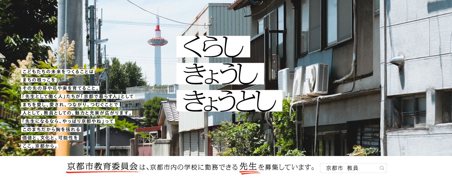 観光都市として世界を魅了する京都は、豊かな環境の中で子どもと大人がともに学び育つことのできる魅力的なまち。 ぜひ、京都ならではの、素敵な暮らしと学びを見つけ、豊かな教職人生を送りませんか。