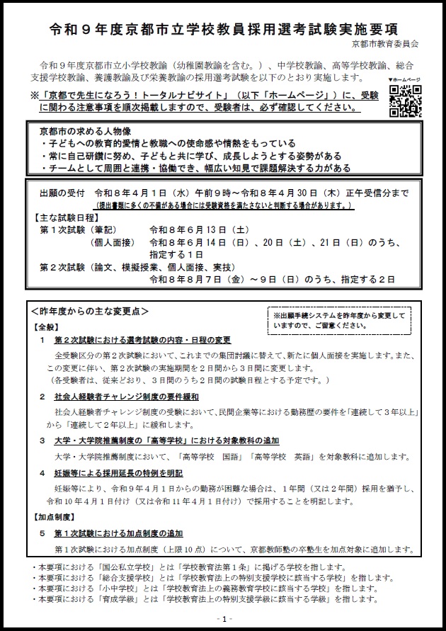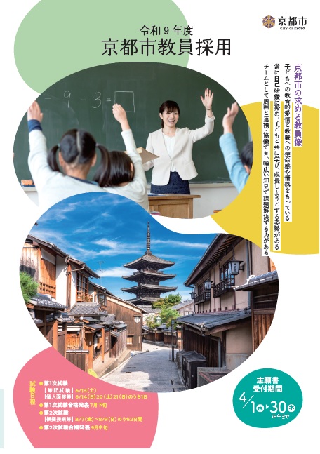 令和9年度京都市立学校教員採用選考試験にかかる大学・大学院推薦制度について、以下のとおり実施いたします。詳細は以下の実施要項をご確認ください。